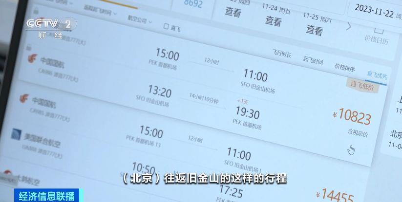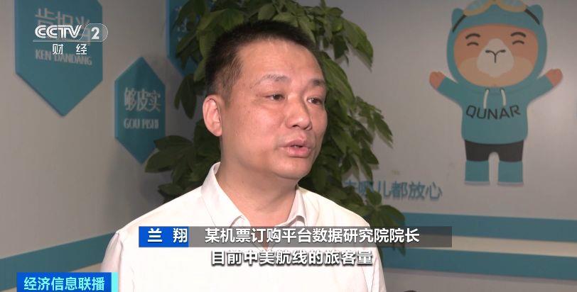 某机票订购平台数据研究院院长 兰翔:目前中美航线的旅客量,差不多已经恢复到2019年的一半左右。中美之间在两个月之内连续不断增加航班,票价相对出现了下降,平均下降50%左右。