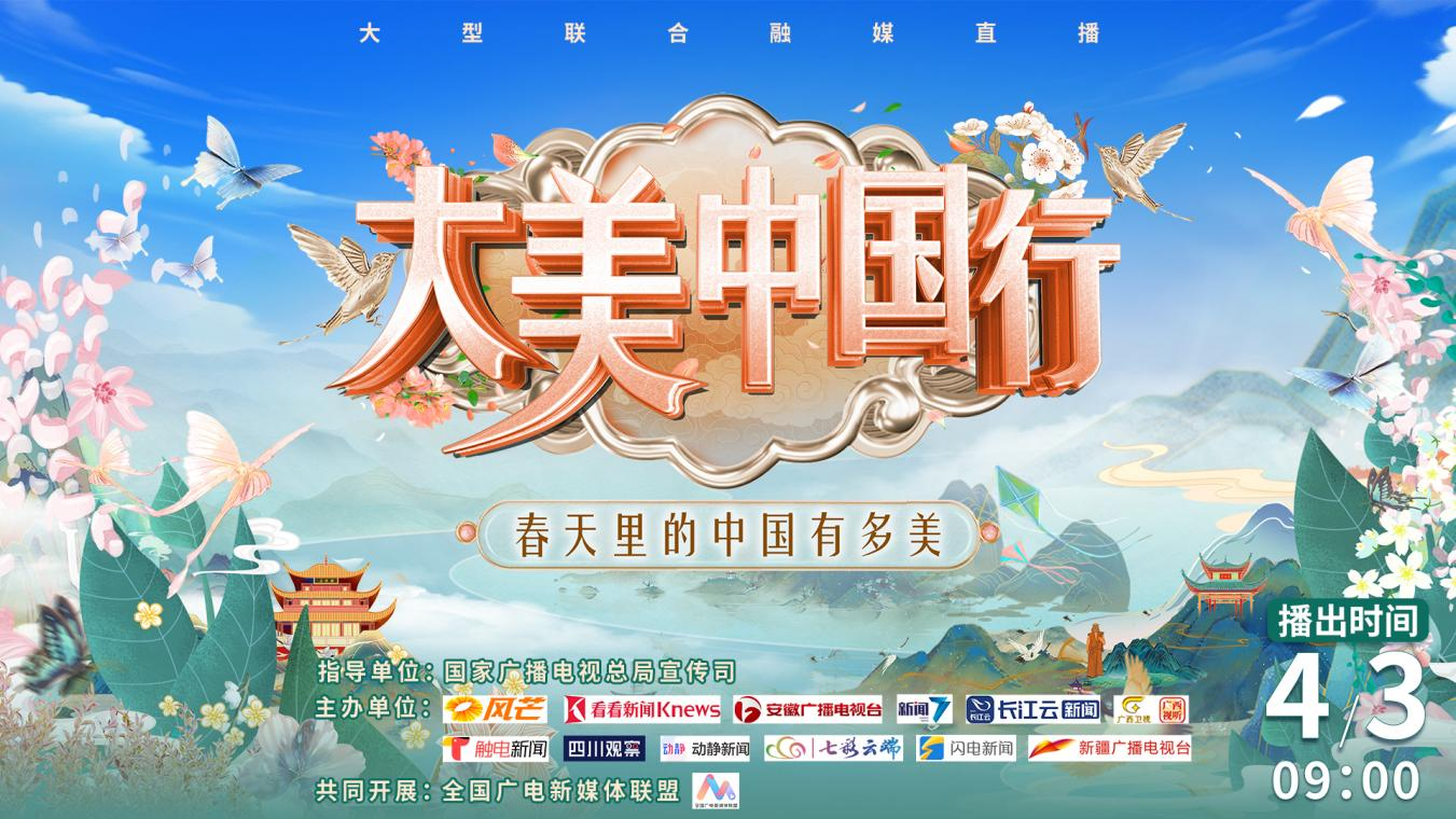 由国家广播电视总局宣传司指导,湖南广播影视集团(台)、上海广播电视台、安徽广播电视台、江西广播电视台、湖北广播电视台、广东广播电视台、广西广播电视台、四川广播电视台、贵州广播电视台、云南广播电视台、新疆广播电视台、山东广播电视台共同主办的大美中国行·春天里的中国有多美——大型融媒体联动直播活动将于4月3日9点起,在各省区市广播电视台主要新媒体平台播出。