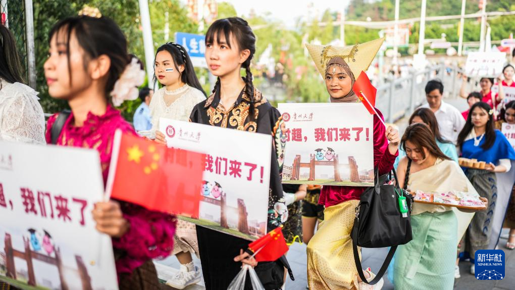 4月13日,贵州大学的留学生们排队进入榕江县“村超”球场。新华社记者 陶亮 摄