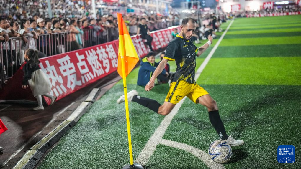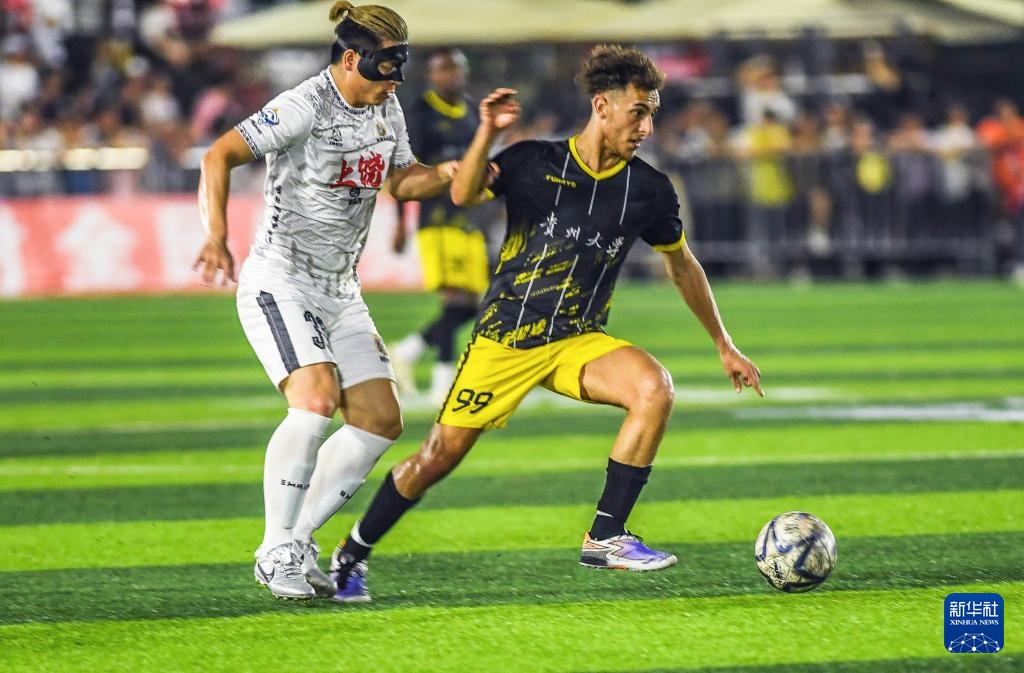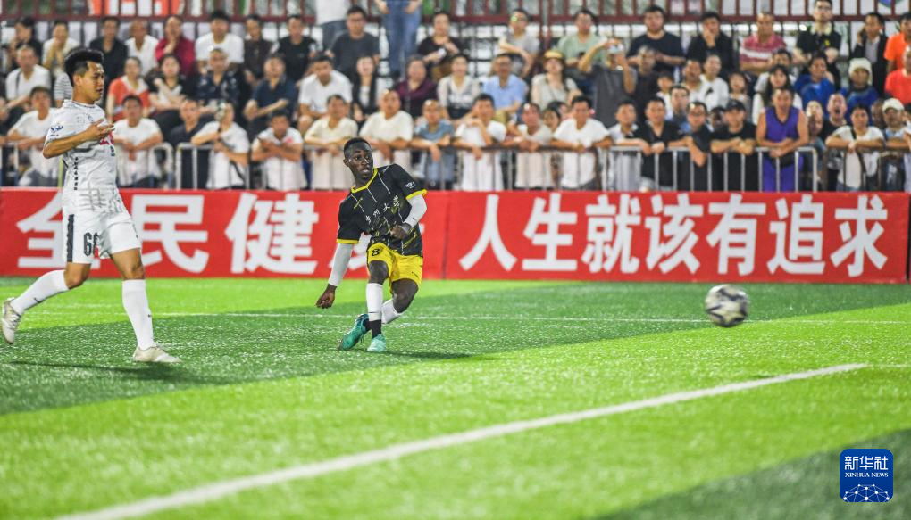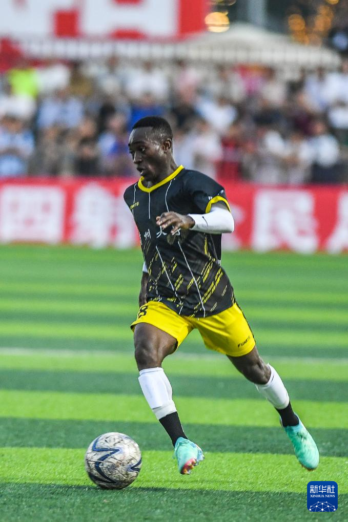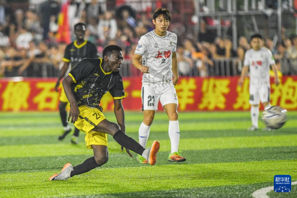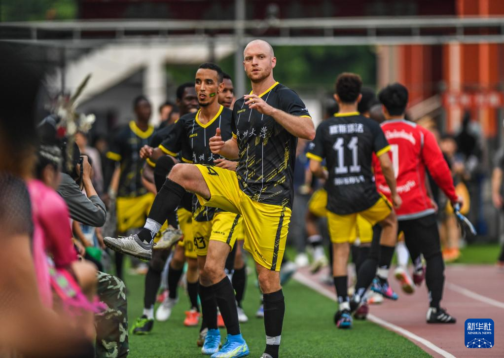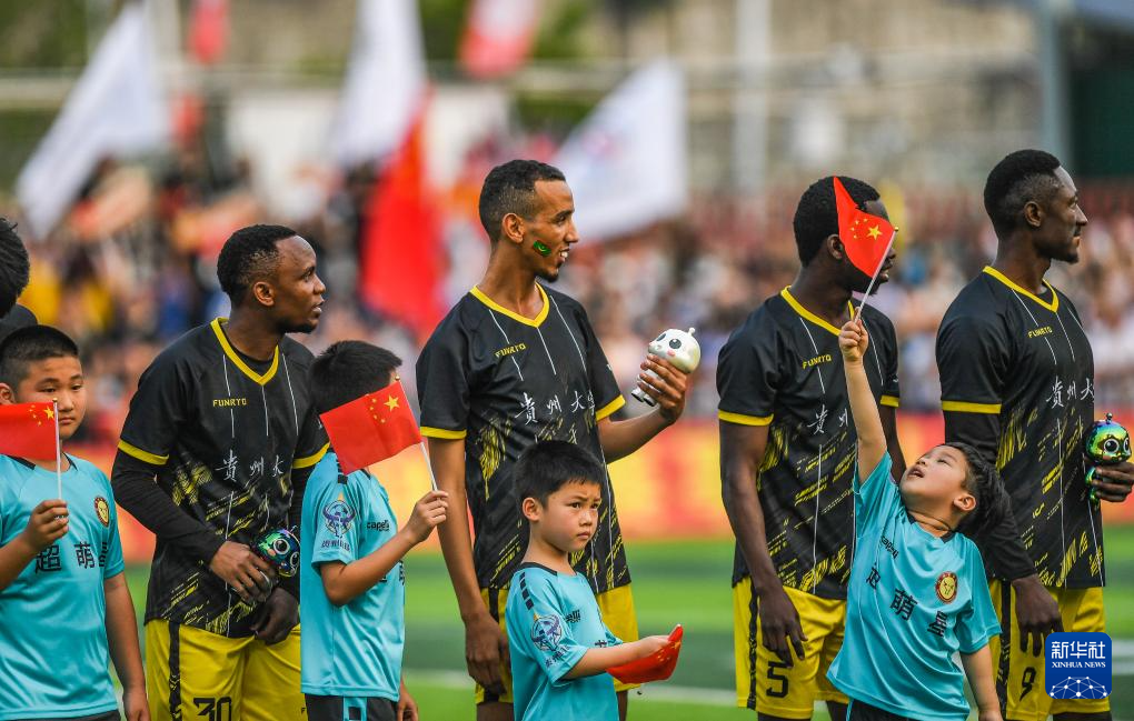 当日,在贵州省黔东南苗族侗族自治州榕江县“村超”足球场,贵州大学国际学生足球队对阵上饶渣渣灰江西米粉足球队。