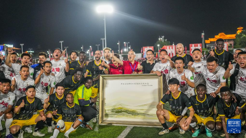 4月13日,贵州大学国际学生足球队和上饶渣渣灰江西米粉足球队成员在赛后合影留念。新华社记者 陶亮 摄