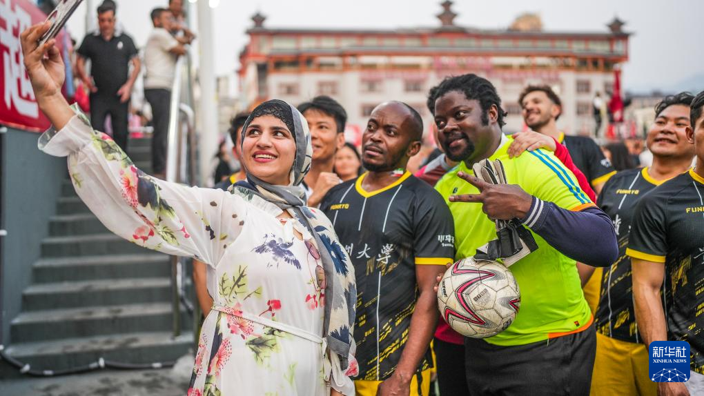 4月13日,一名女留学生和贵州大学国际学生足球队球员自拍合影。新华社记者 陶亮 摄