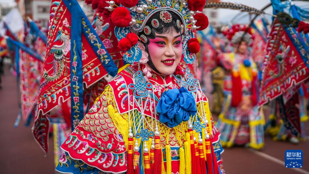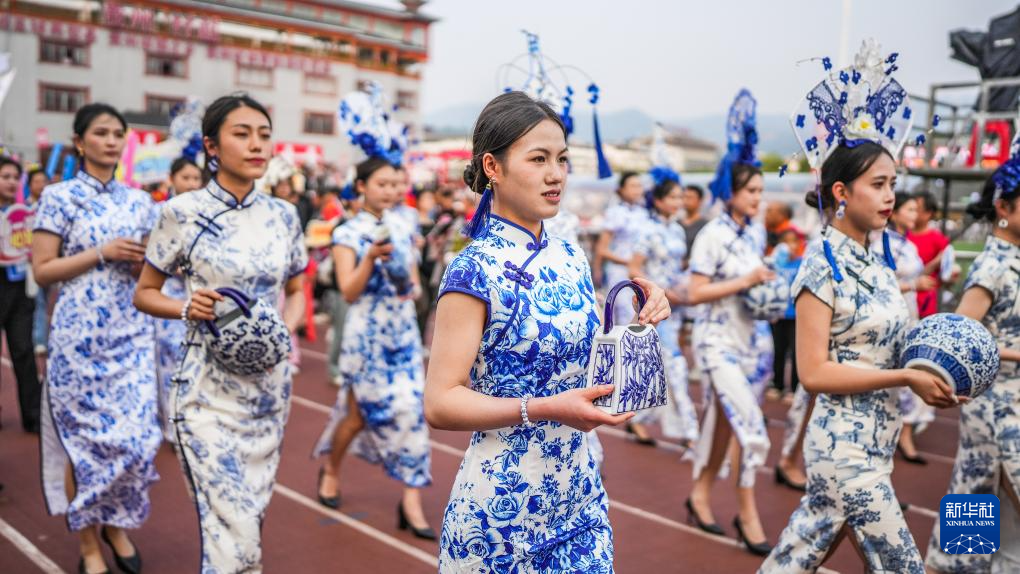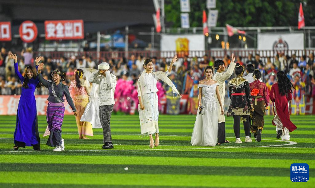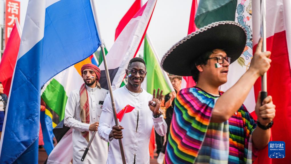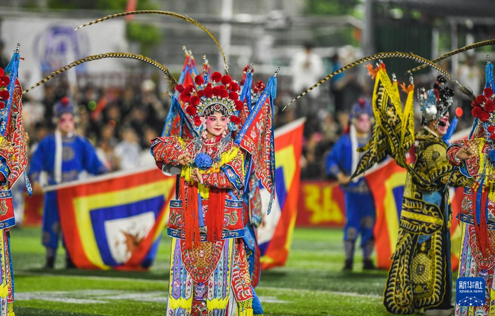 4月13日,贵州大学的留学生们在中场休息时进行歌舞表演并向观众示意。新华社记者 陶亮 摄