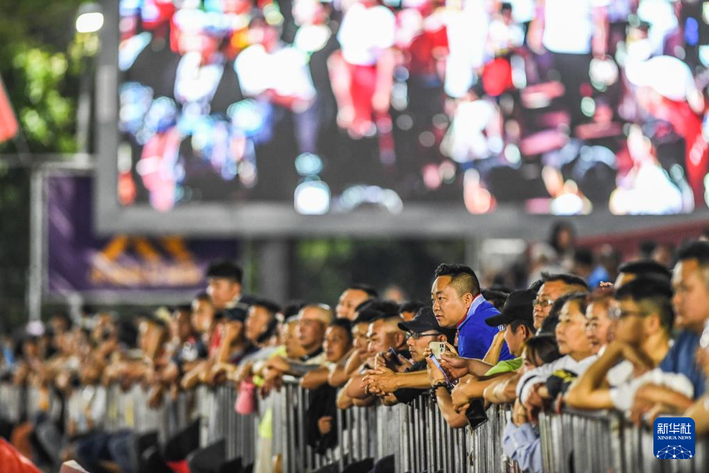4月13日,观众在“村超”足球场边观看比赛。新华社记者 陶亮 摄
