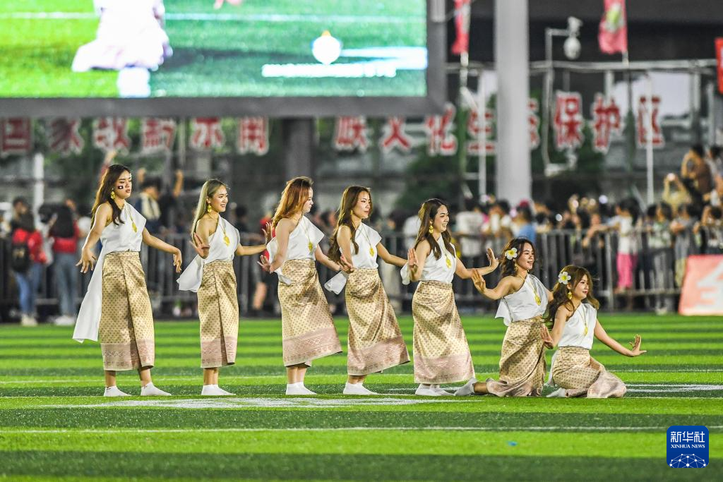 4月13日,贵州大学的留学生们在中场休息时进行歌舞表演。新华社记者 陶亮 摄