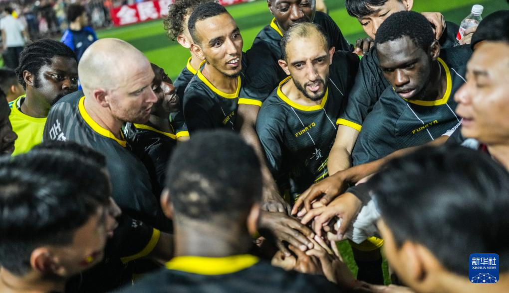 4月13日,贵州大学国际学生足球队球员互相加油鼓劲。新华社记者 陶亮 摄