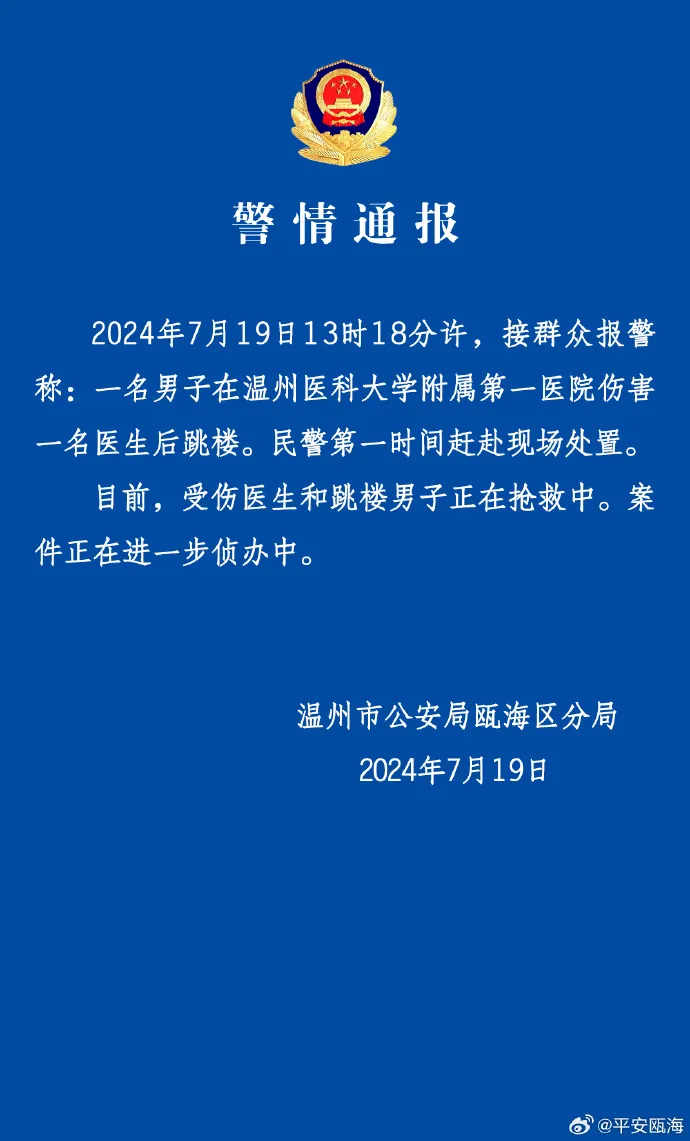 2024年7月19日13时18分许,接群众报警称:一名男子在温州医科大学附属第一医院伤害一名医生后跳楼。民警第一时间赶赴现场处置。目前,受伤医生和跳楼男子正在抢救中。案件正在进一步侦办中。