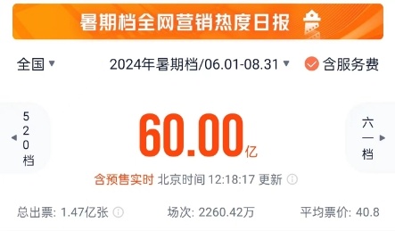 据网络平台实时数据,截至今日12时18分 ,2024年暑期档(6月—8月)档期总票房(含预售)突破60亿!