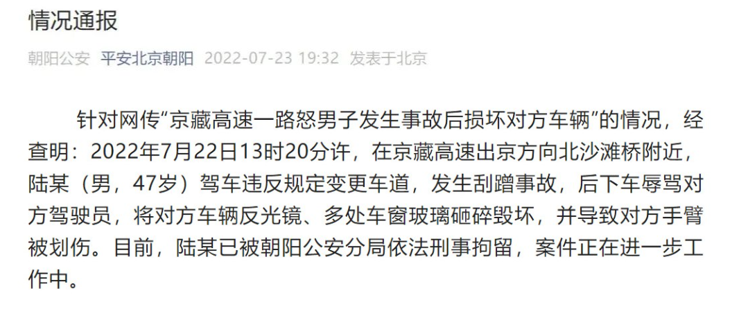 针对网传“京藏高速一路怒男子发生事故后损坏对方车辆”的情况,经查明:2022年7月22日13时20分许,在京藏高速出京方向北沙滩桥附近,陆某(男,47岁)驾车违反规定变更车道,发生剐蹭事故,后下车辱骂对方驾驶员,将对方车辆反光镜、多处车窗玻璃砸碎毁坏,并导致对方手臂被划伤。目前,陆某已被朝阳公安分局依法刑事拘留,案件正在进一步工作中。