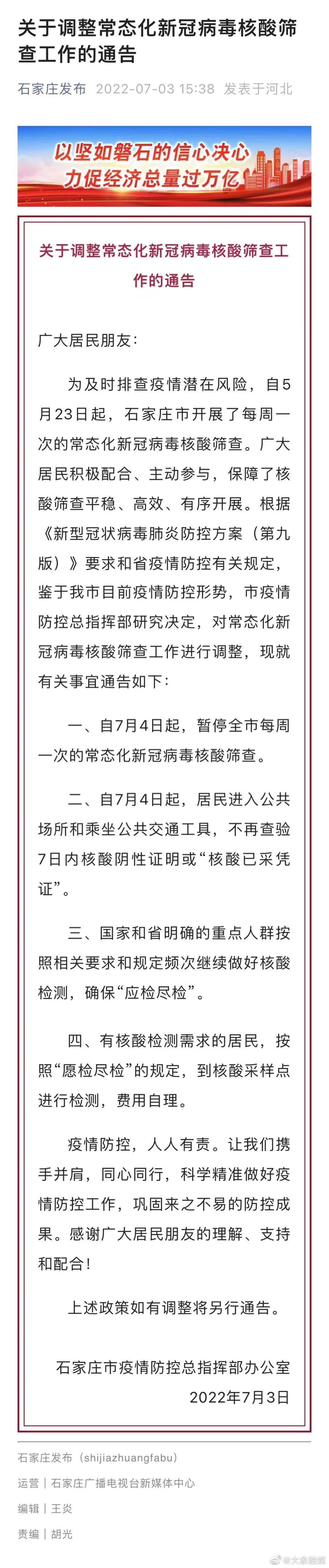 “石家庄发布”7月3日发布通告:7月4日起,暂停全市每周一次的常态化新冠病毒核酸筛查。居民进入公共场所和乘坐公共交通工具,不再查验7日内核酸阴性证明或“核酸已采凭证”。