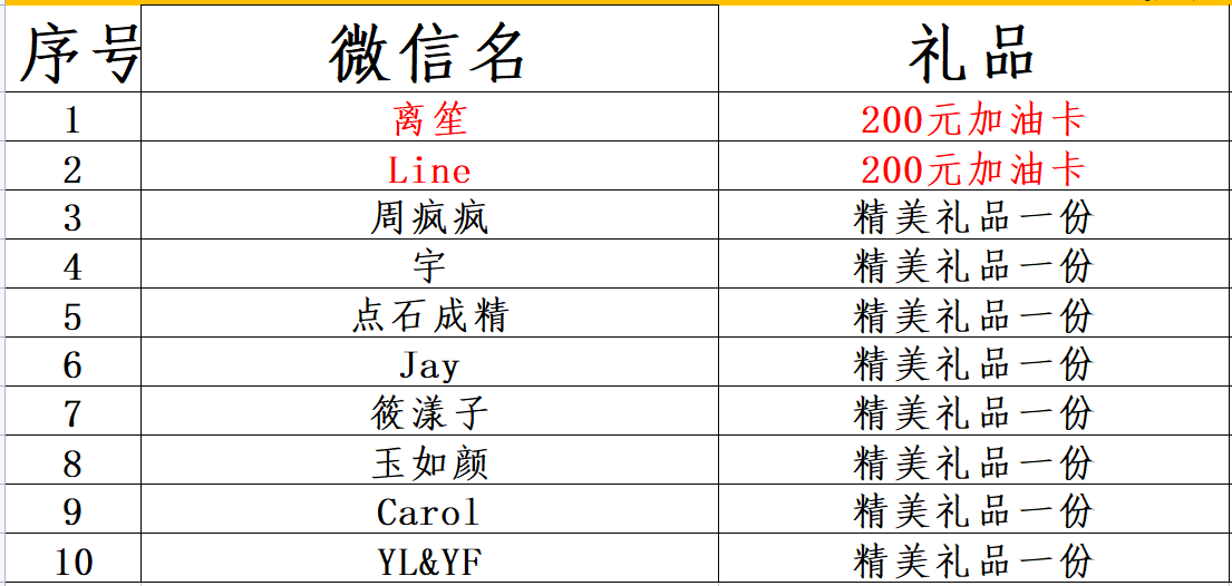 参加活动的中奖名单