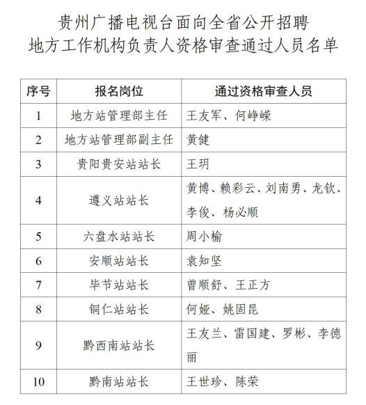 贵州广播电视台面向全省公开招聘地方工作机构负责人于2022年4月14日至4月18日进行网上报名,截至报名结束,共有29人报名。经资格审查,22人符合报名条件,现将通过资格审查人员名单予以公示。