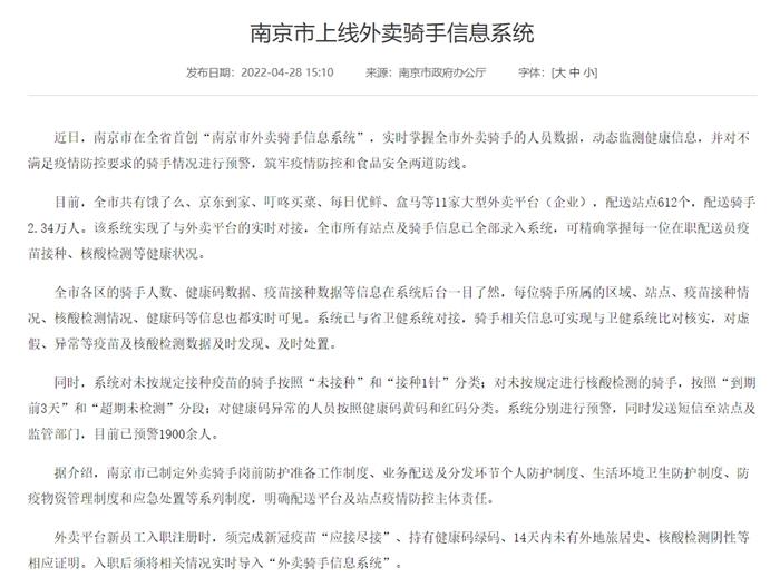 例如,南京市4月底上线了“南京市外卖骑手信息系统”,该系统实现了与外卖平台的实时对接,全市所有站点及骑手信息已全部录入系统,可精确掌握每一位在职配送员疫苗接种、核酸检测等健康状况。涉及11家大型外卖平台(企业),配送站点612个,配送骑手2.34万人。