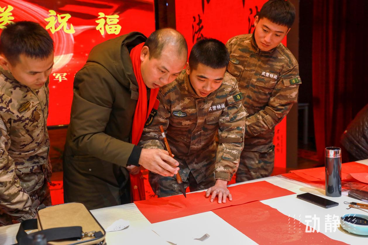 鲜红的纸张渲染着浓浓的节日氛围。书法老师与官兵们面对面交流、手把手教学。