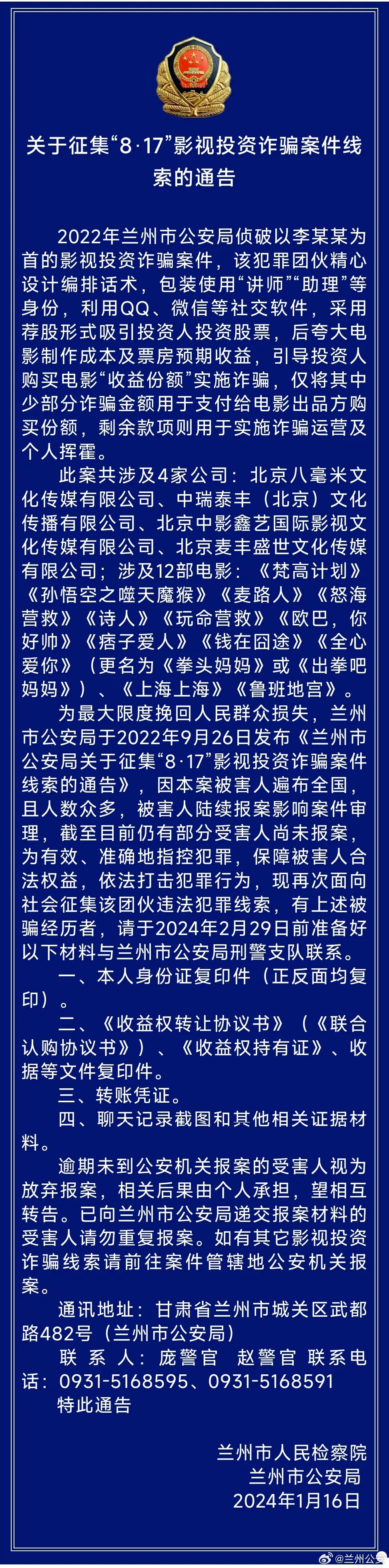 为最大限度挽回人民群众损失,兰州市公安局早在2022年9月26日发布《兰州市公安局关于征集“8·17”影视投资诈骗案件线索的通告》,但因本案被害人遍布全国,且人数众多,受害人陆续报案影响案件审理,截至目前仍有部分受害人尚未报案。