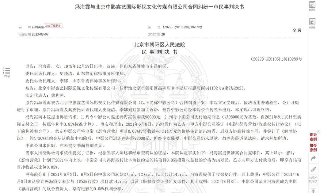 根据民事判决书显示,2021年6月8日,冯某某作为乙方与甲方北京中影鑫艺国际影视文化传媒有限公司签订《电影<怒海营救>收益权转让协议》。影片《怒海营救》计划于2021年内上映(注:《怒海营救》至今未上映,最新消息显示定档于2024年5月1日),北京中影鑫艺国际影视文化传媒有限公司向冯某某转让本协议约定的该项目0.05%投资收益权的价格为14万元,乙方向甲方支付款项后,即享有该项目净收益权比例0.05%,成为电影《怒海营救》的联合投资人。