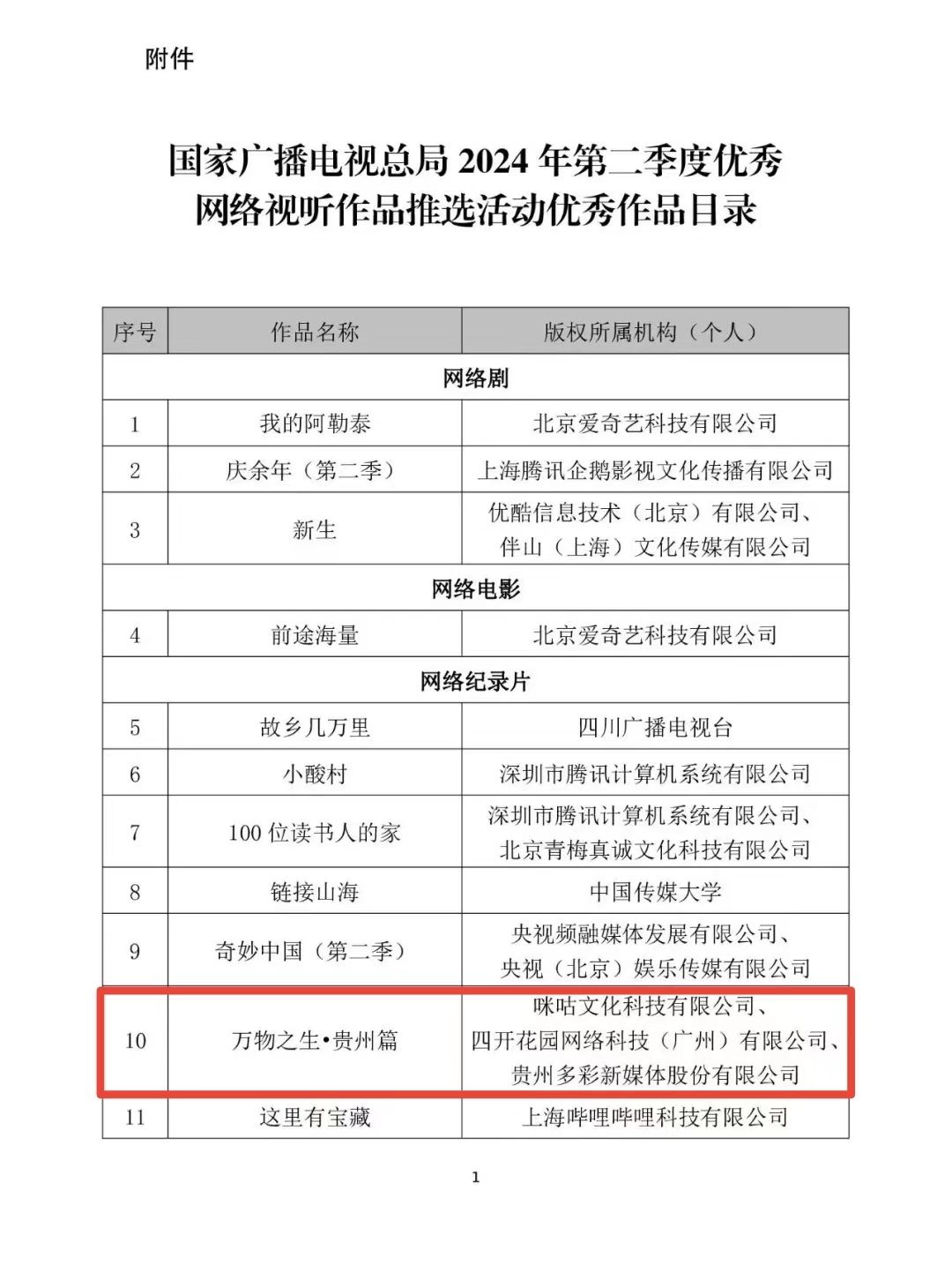 9月30日,国家广播电视总局公布2024年第二季度优秀网络视听作品推选活动评审结果,其中贵州广播电视台旗下贵州多彩新媒体股份有限公司制作的《万物之生·贵州篇》荣获优秀网络纪录片。
