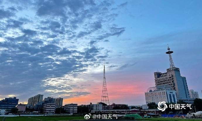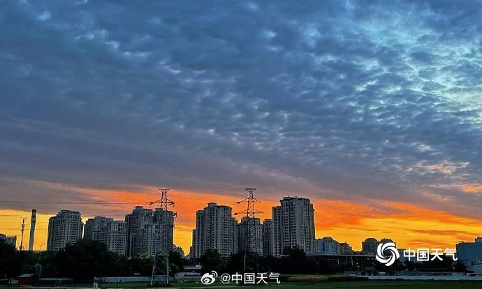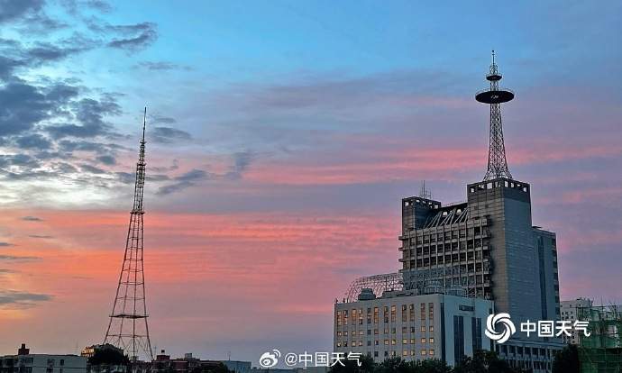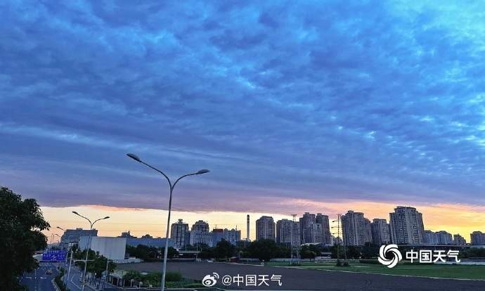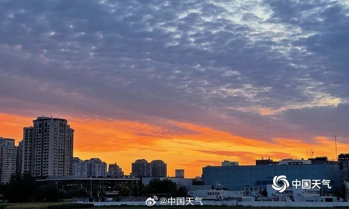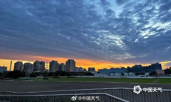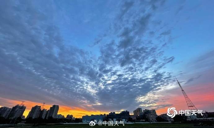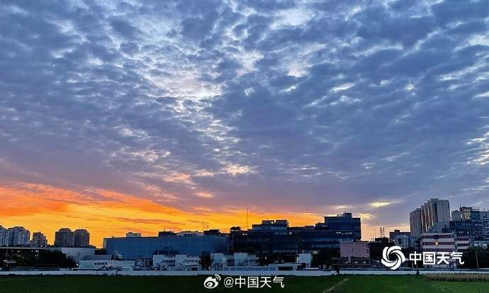 今天(9月19日)早晨,北京云层如丝绒地毯般铺展开来,与远处橙粉朝霞将天空映衬得格外美丽。