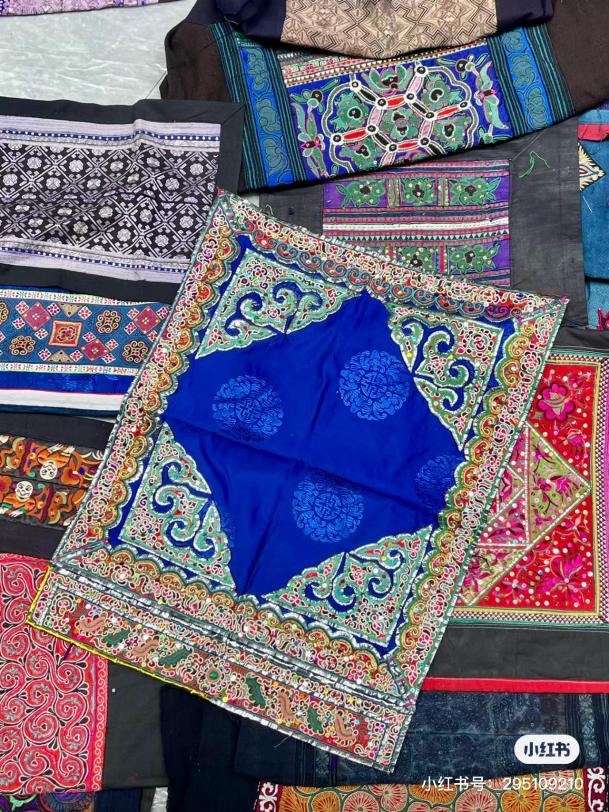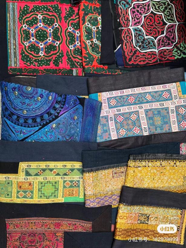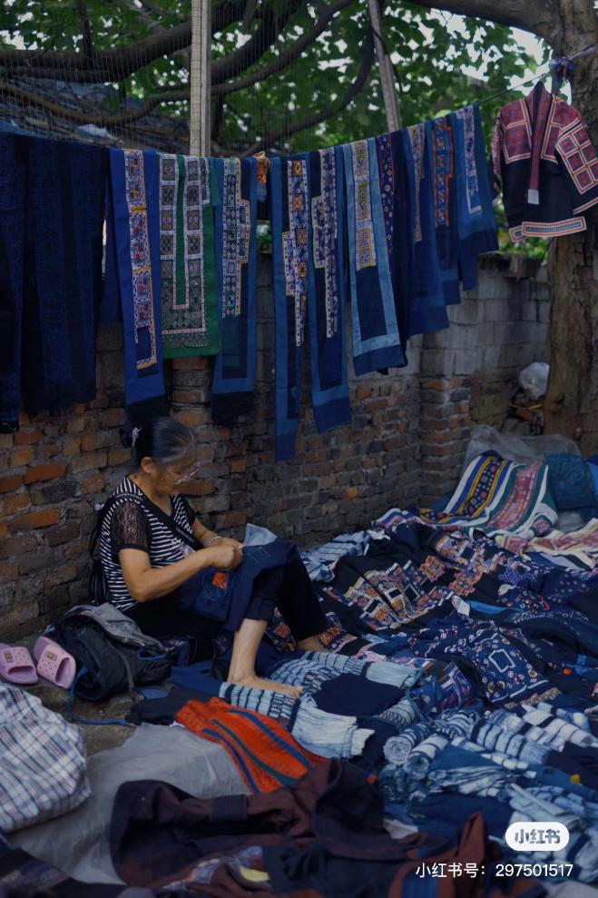 在市集上,摆满了少数民族绣品、服饰、布料、绣片,琳琅满目的货品,你可以细细挑选。来摆摊的人许多是来自周边村寨的老人和妇女,市集里大部分是手工制作的绣品,摊主们会一边摆摊,一边做刺绣,与流水线的工艺流程不同,这里的一针一线里仿佛拥有灵魂,饱含着对生活的期盼。