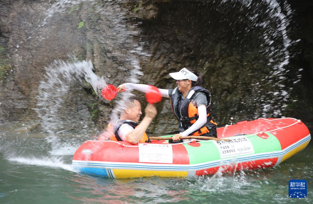 7月22日,游客在贵州省黔东南苗族侗族自治州施秉县杉木河景区漂流、戏水。