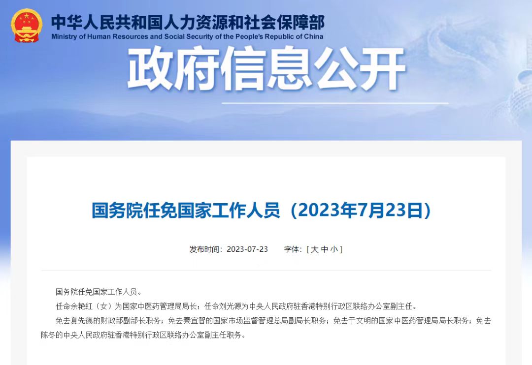据人力资源和社会保障部网站7月23日消息,国务院任免国家工作人员。