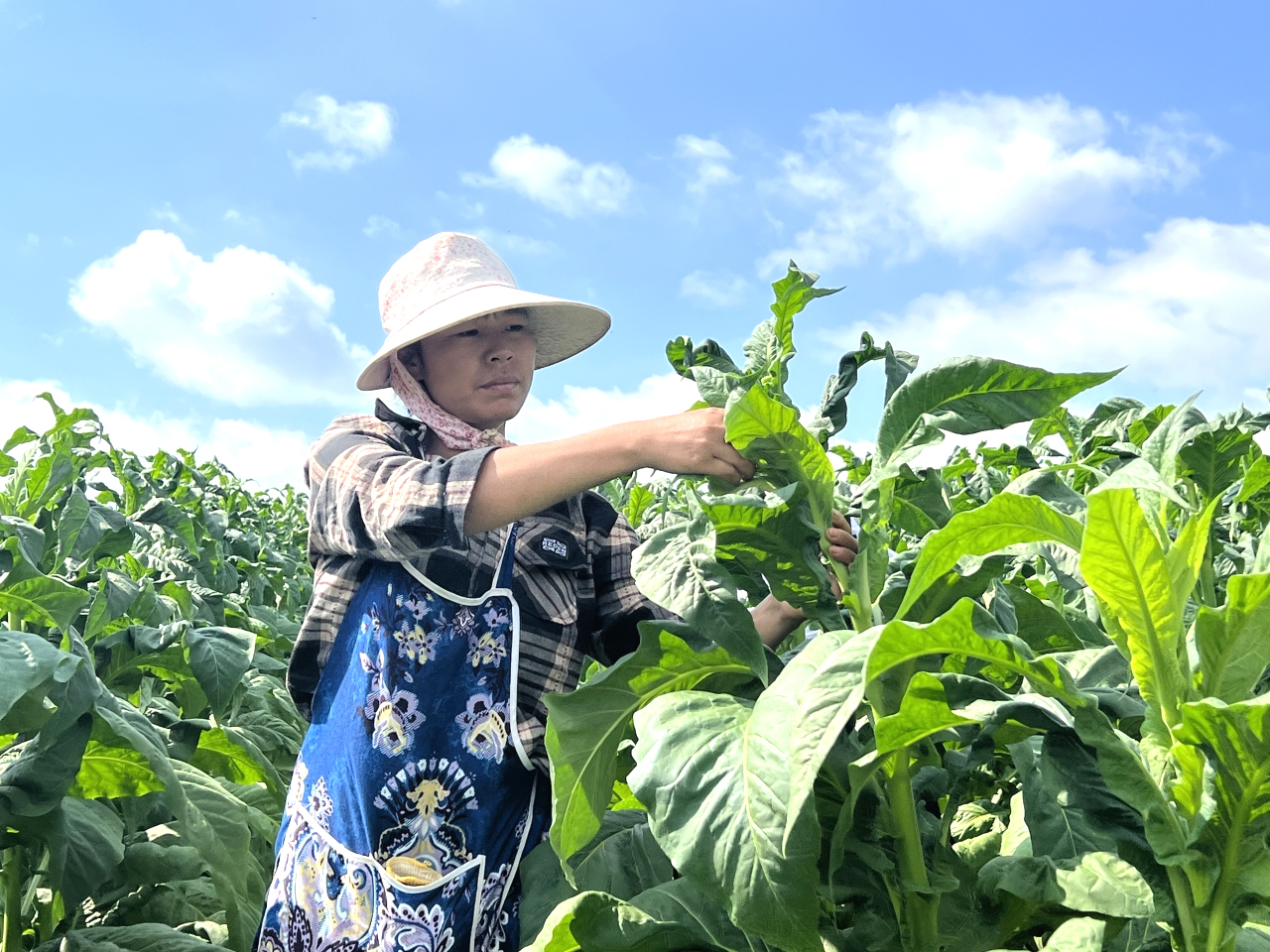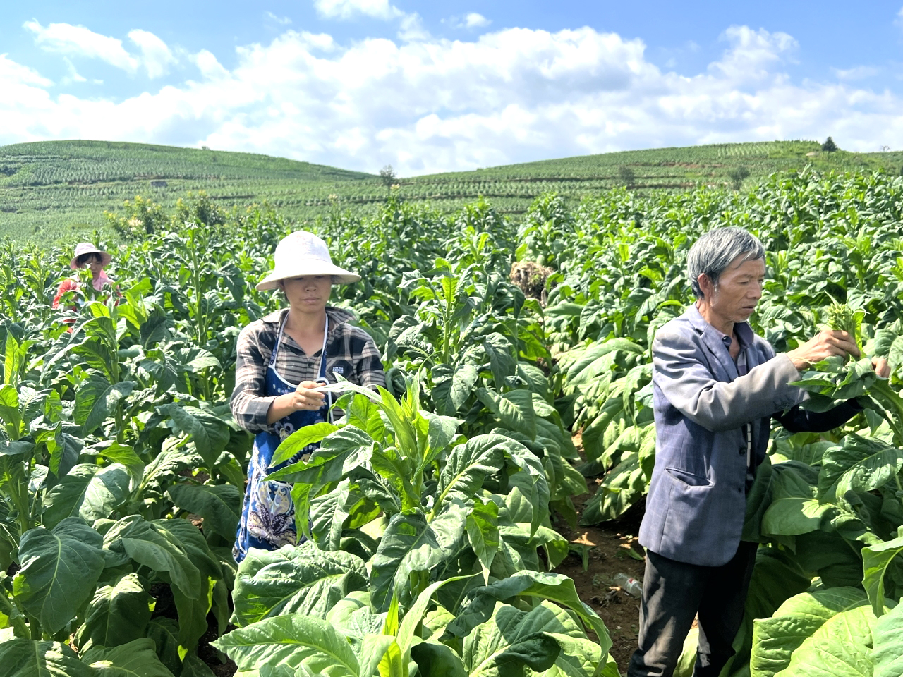 连日来,种植大户何涛每天都忙着带领烟农给烤烟打顶抹芽、清除脚叶。