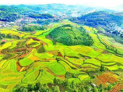 9月11日,贵州省黔西市雨朵镇坝区,金黄的稻田和村庄、远山构成一幅美丽的秋日画卷。