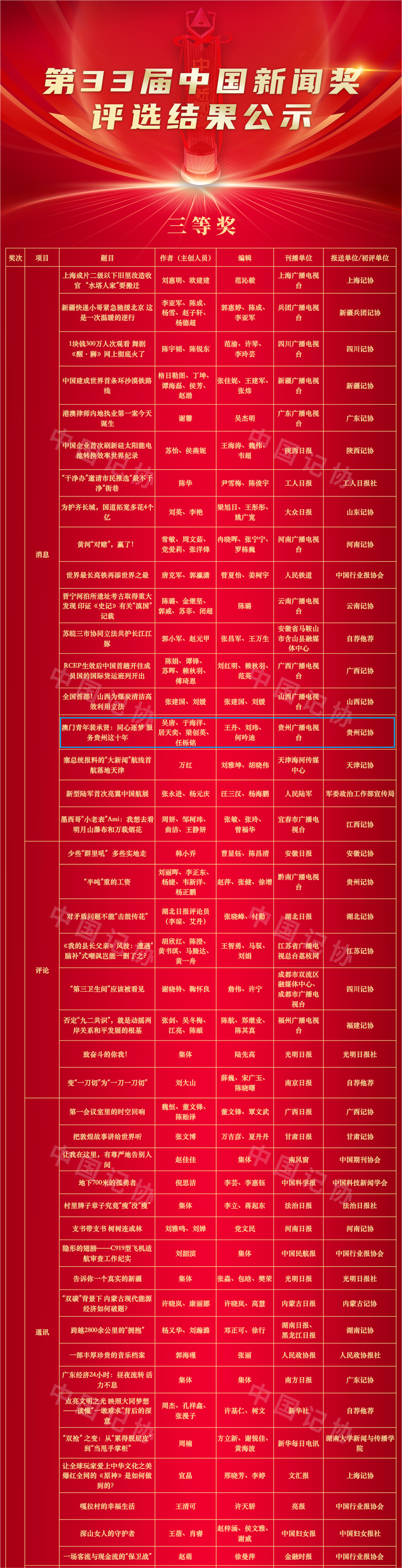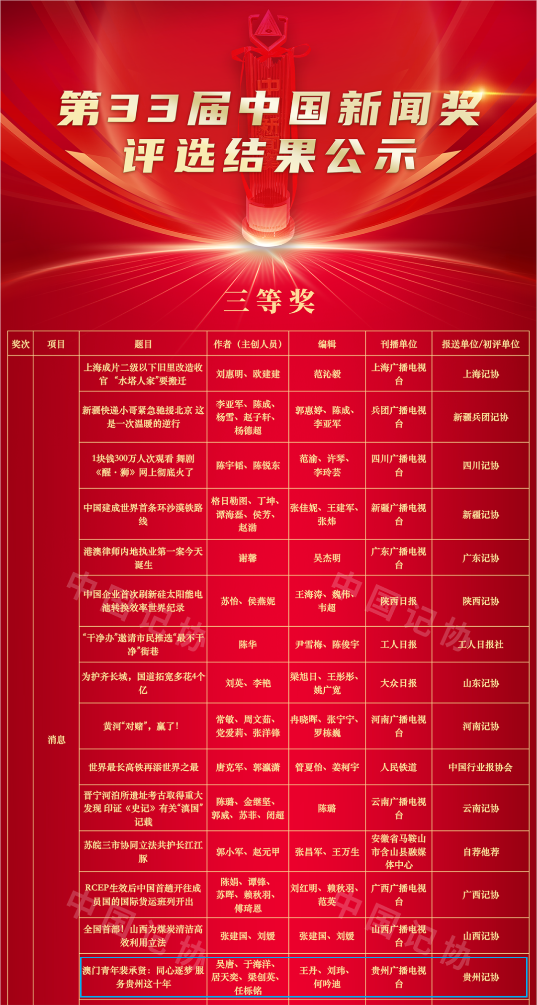 今天(9月20日),第33届中国新闻奖评选结果进行公示,贵州广播电视台采编作品《澳门青年裴承贤:同心逐梦 服务贵州这十年》拟获中国新闻奖消息类三等奖。