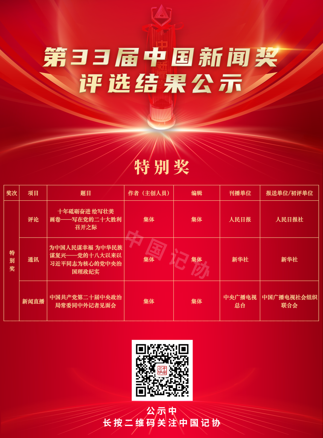 由中华全国新闻工作者协会(简称“中国记协”)主办的第33届中国新闻奖评选结果自今日起在中国记协微信公众号、中国记协网公示。本届拟获奖作品378件,其中特别奖3件、一等奖74件、二等奖114件、三等奖187件。