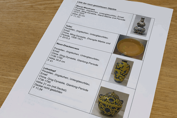 当地时间9月12日夜间,德国科隆的一家东亚艺术博物馆被盗,工作人员清点后发现共有9件中国明清时期制造的花瓶、瓷盘和瓷罐等藏品失窃,价值超过100万欧元。博物馆的保安称,两名盗贼是在午夜后破窗进入的。警方目前正在搜查破案线索。