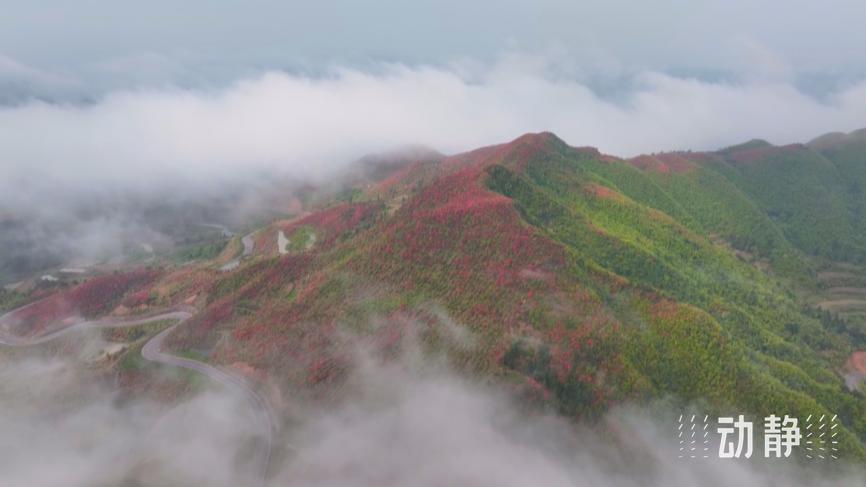 黔东南州黄平县谷陇镇大高山海拔1300 米,这段时间杜鹃花相继绽放,红遍山头,山顶云雾缭绕,仿佛为整片杜鹃花海披上了一层飘动的头纱,吸引不少游客探秘花丛。