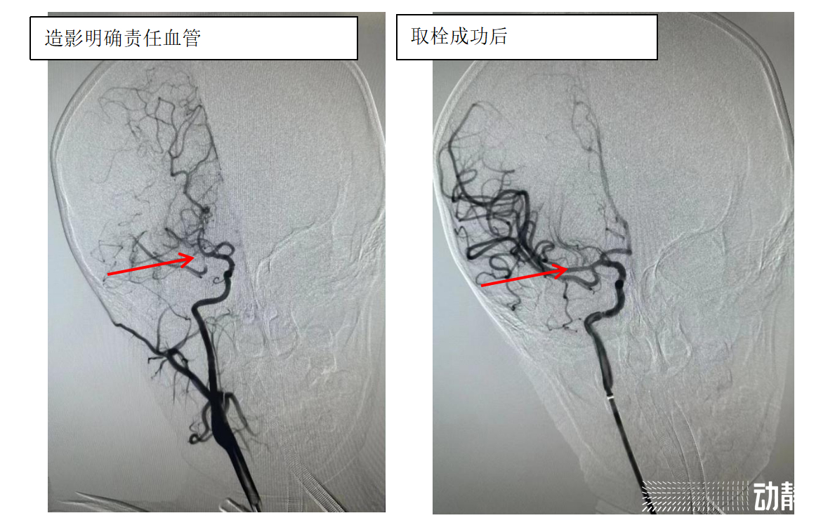 在麻醉科、小儿重症医学科等专业人员床旁监护下,介入团队成功在患儿脑组织窗内进行介入手术,成功取出患儿“肇事血栓”,右侧大脑中动脉前向血流恢复,为患儿疏通了“生命河流”。术后,瀛瀛在儿科重症医师的精心治疗下,逐渐恢复正常,目前已经顺利出院。