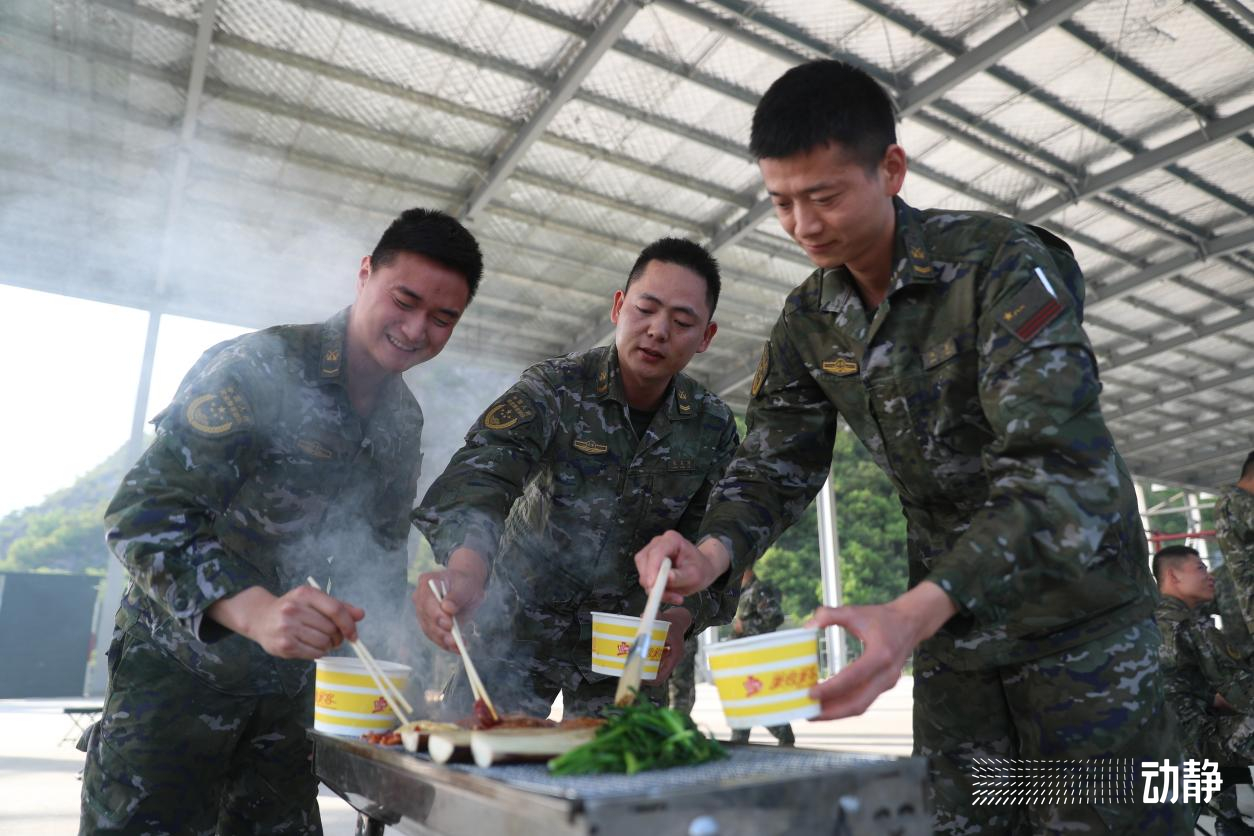 架好烧烤炉、摆上新鲜食材,“军营自助烧烤”开启。官兵们“大秀厨艺”,乐在其中。