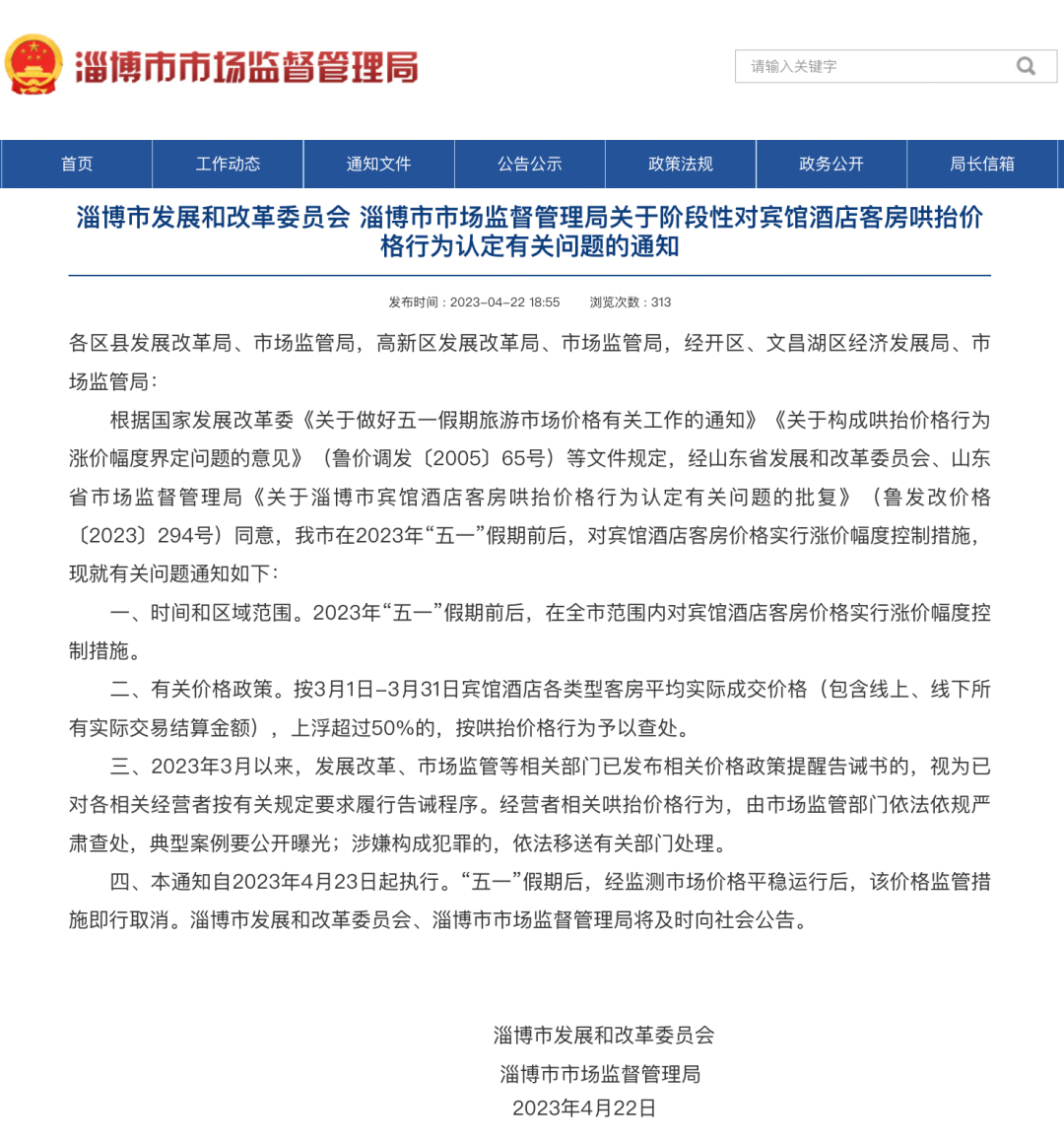 根据国家发展改革委《关于做好五一假期旅游市场价格有关工作的通知》《关于构成哄抬价格行为涨价幅度界定问题的意见》(鲁价调发〔2005〕65号)等文件规定,经山东省发展和改革委员会、山东省市场监督管理局《关于淄博市宾馆酒店客房哄抬价格行为认定有关问题的批复》(鲁发改价格〔2023〕294号)同意,我市在2023年“五一”假期前后,对宾馆酒店客房价格实行涨价幅度控制措施,现就有关问题通知如下: