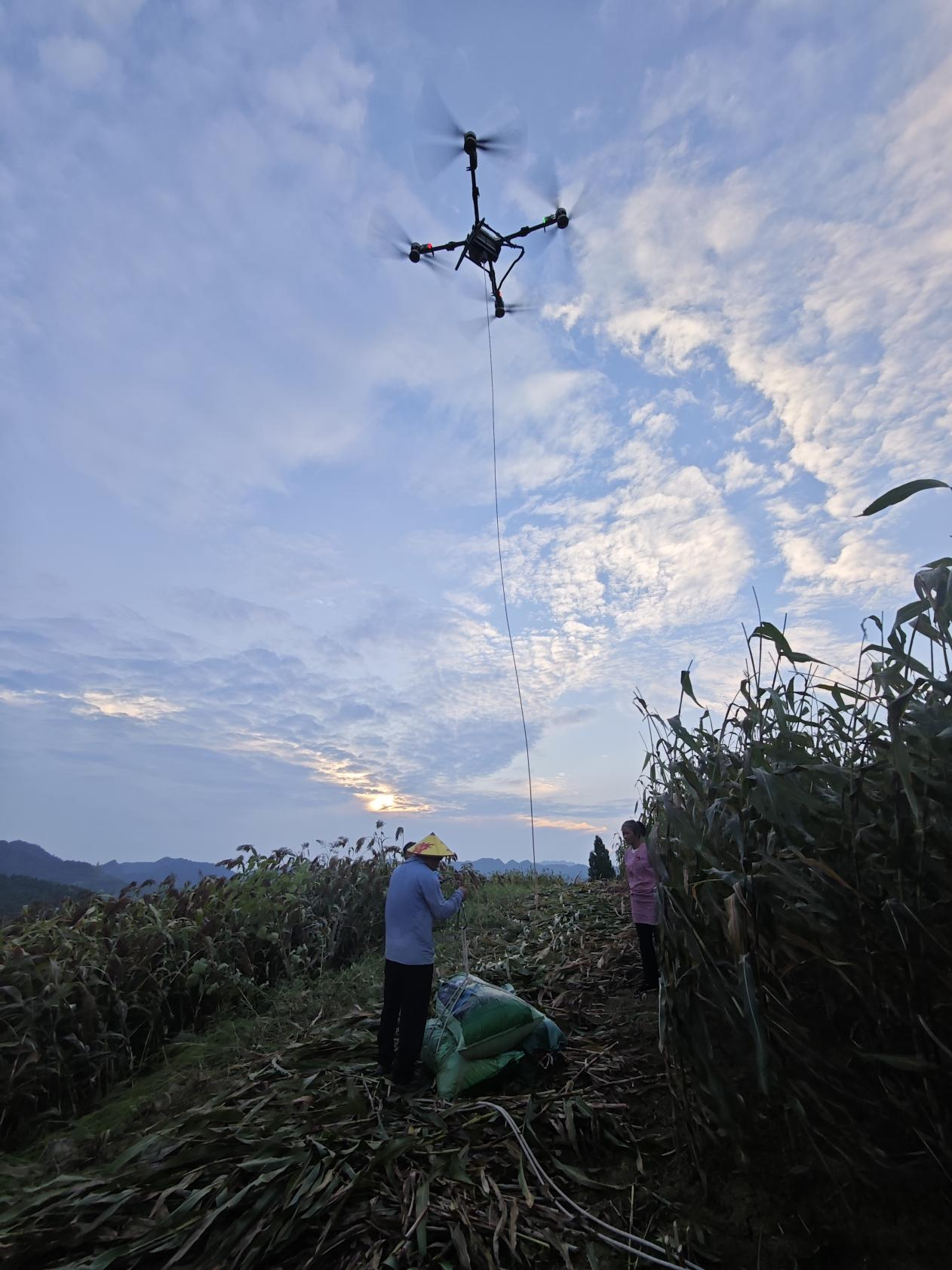 在仁怀市茅坝镇官院村的陡坡田垄间,一阵规律的旋翼声划破清晨的宁静——村民赵付奇不再弯腰弓背、肩挑重担,他眯着眼笑着,看一架无人机稳稳抓起刚收割的红高粱,沿着既定航线腾空而起,飞向山下的农家院坝。“我们这里坡陡路难走,以前一亩高粱折腾大半天,现在百把块钱,几分钟就能送到家!”他的感叹里满是卸下重担的轻松。