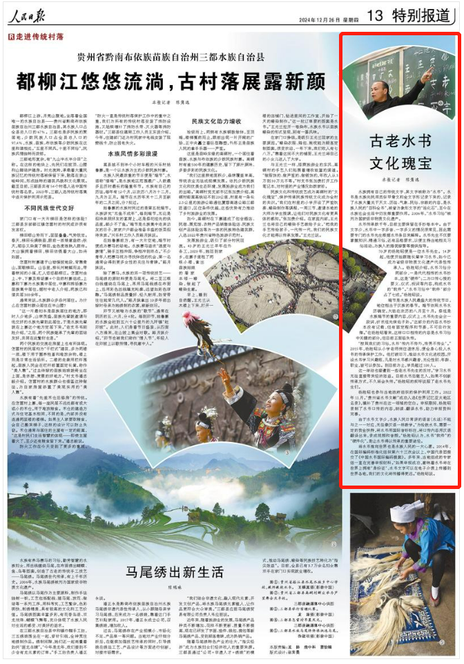 杨胜昭也参与当地政府组织的保护利用工作。2022年11月,“贵州省水书文献”成功入选《世界记忆亚太地区名录》,填补了贵州在这一领域的空白。申报期间,杨胜昭录制了水书口传的内容,朗读、翻译水书,助力申报资料完善。