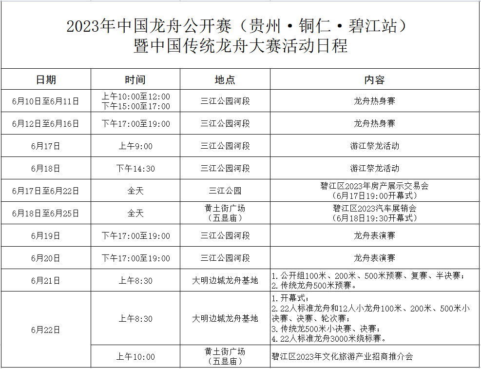 6月21日至6月22日(端午节)在铜仁市碧江区大明边城龙舟基地举行,将有70余支队伍3000余人参赛。