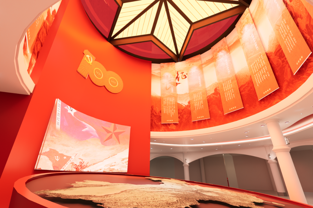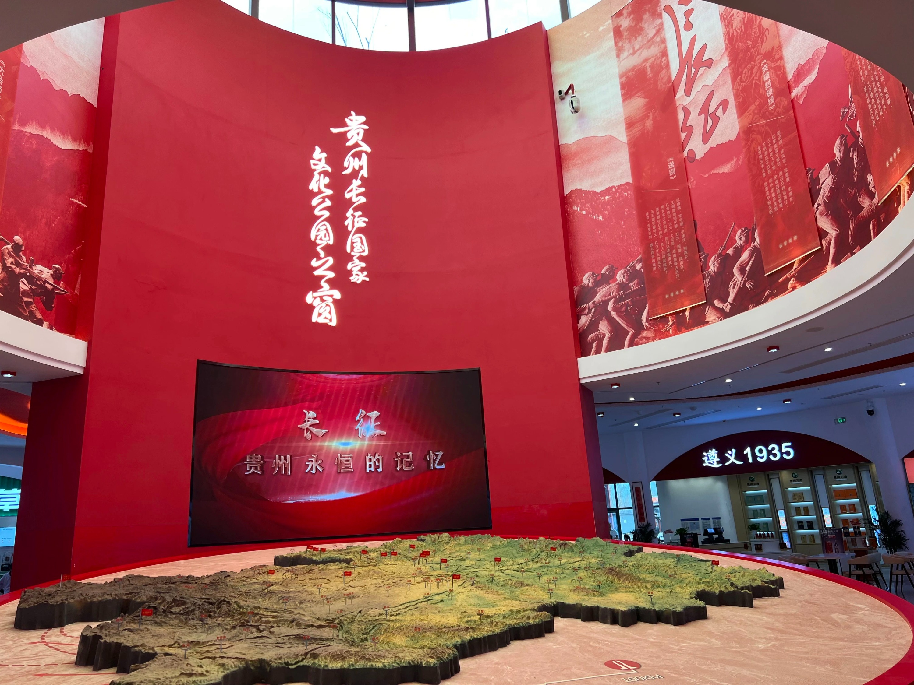 中间区域是红色展示区,抬头能看到一面巨型屏幕,上面正在播放着长征文化相关宣传片,前方的电子沙盘展示的是中国工农红军长征路线图。在二楼,有会议室、休息室、文化展览区、办公区等。在长征文化展览区,游客可以沉浸式体验长征文化。