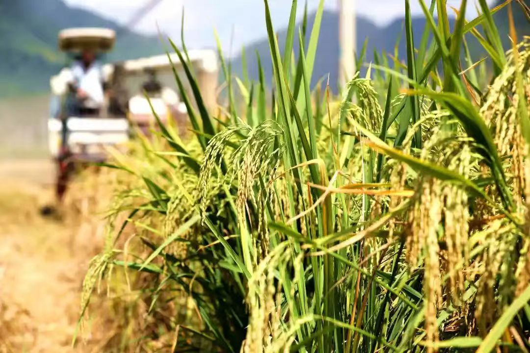 在遵义市红花岗区海龙镇贡米村,收割机在稻田里来回穿梭,脱粒、粉碎稻秆一气呵成。贡米村党总支部副书记左康红说,机械化收割效率高,大大降低了农民的劳动强度。