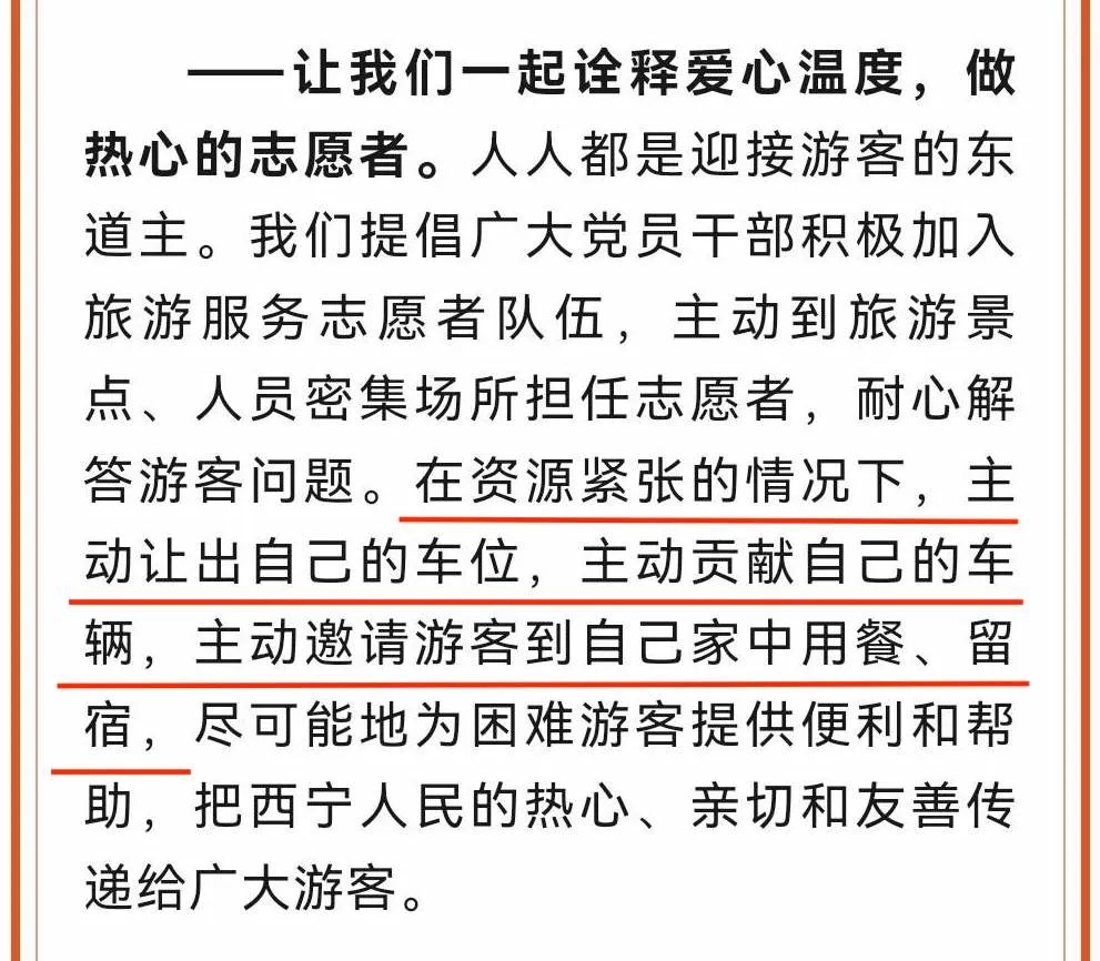 6月15日,青海省西宁市文明办通过微信公众号“文明西宁”发布积极做好旅游旺季服务保障工作的《倡议书》。其中号召全市党员干部,“在资源紧张的情况下,主动让出自己的车位,主动贡献自己的车辆,主动邀请游客到自己家中用餐、留宿,尽可能地为困难游客提供便利和帮助,把西宁人民的热心、亲切和友善传递给广大游客。”