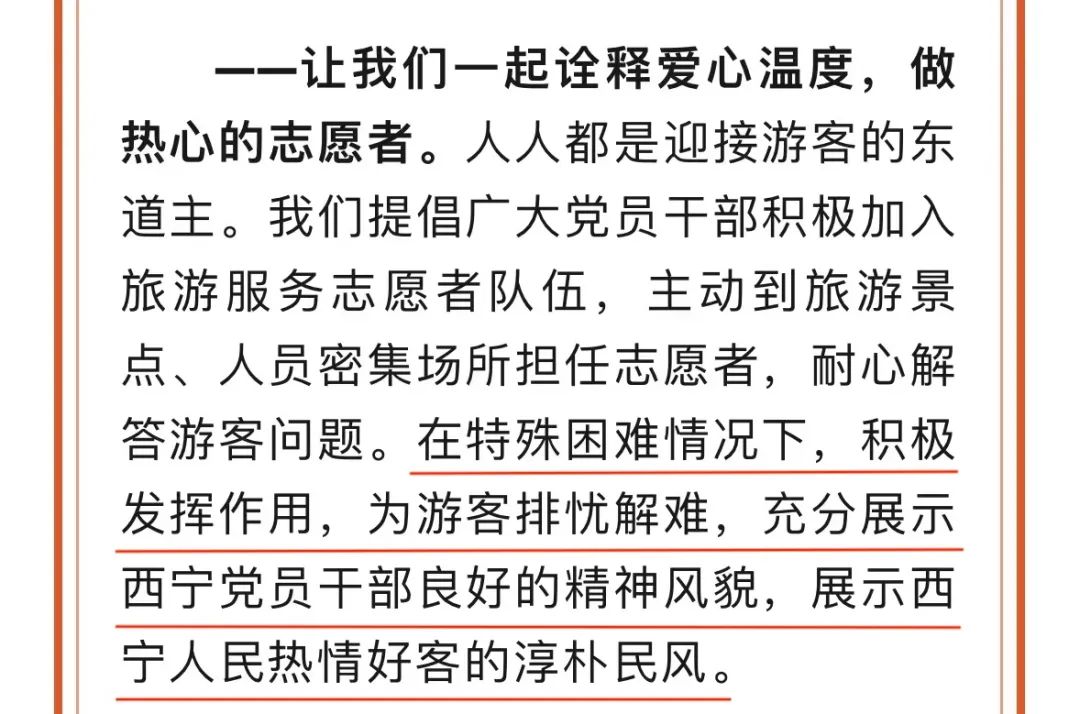 记者注意到,前文所述的倡议内容,在17日《倡议书》中已修改为:“在特殊困难情况下,积极发挥作用,为游客排忧解难,充分展示西宁党员干部良好的精神风貌,展示西宁人民热情好客的淳朴民风。”(全文详见链接)