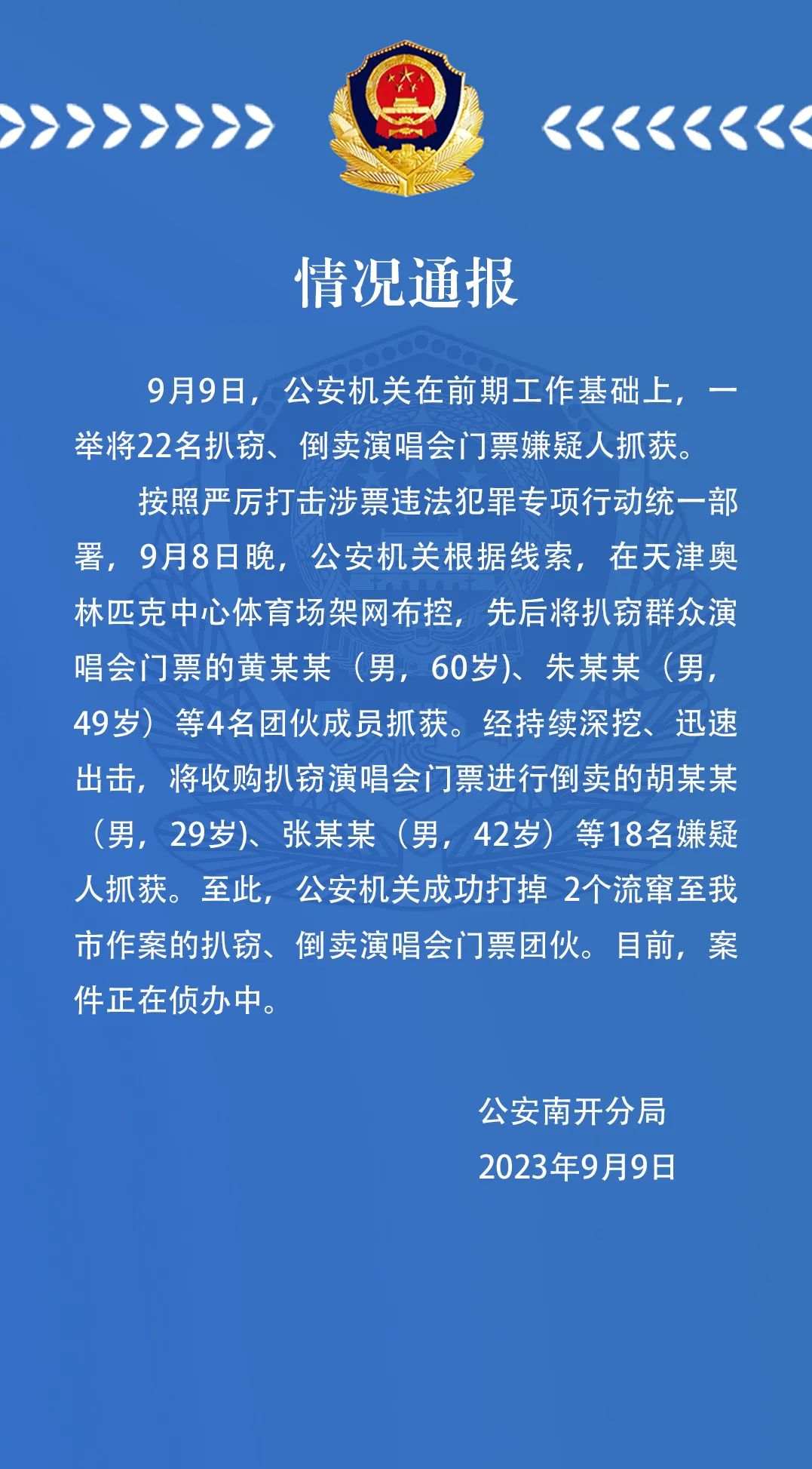 9月9日,天津市公安局南开分局发布情况通报。9月9日,公安机关在前期工作基础上,一举将22名扒窃、倒卖演唱会门票嫌疑人抓获。