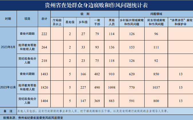 2023年8月贵州省查处群众身边腐败和作风问题222起