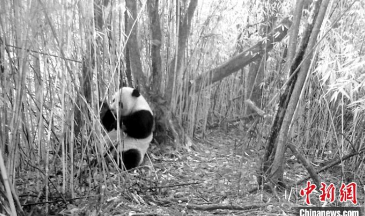 在另一台相机中,一只野生大熊猫从视频画面上迈着“猫步”缓缓走向前,来到一棵大树后,它嗅了嗅树桩,随即停留下来蹭屁股做记号,整个画面像是在练习“瑜伽”,完美展现大熊猫呆萌、俏皮的形象。