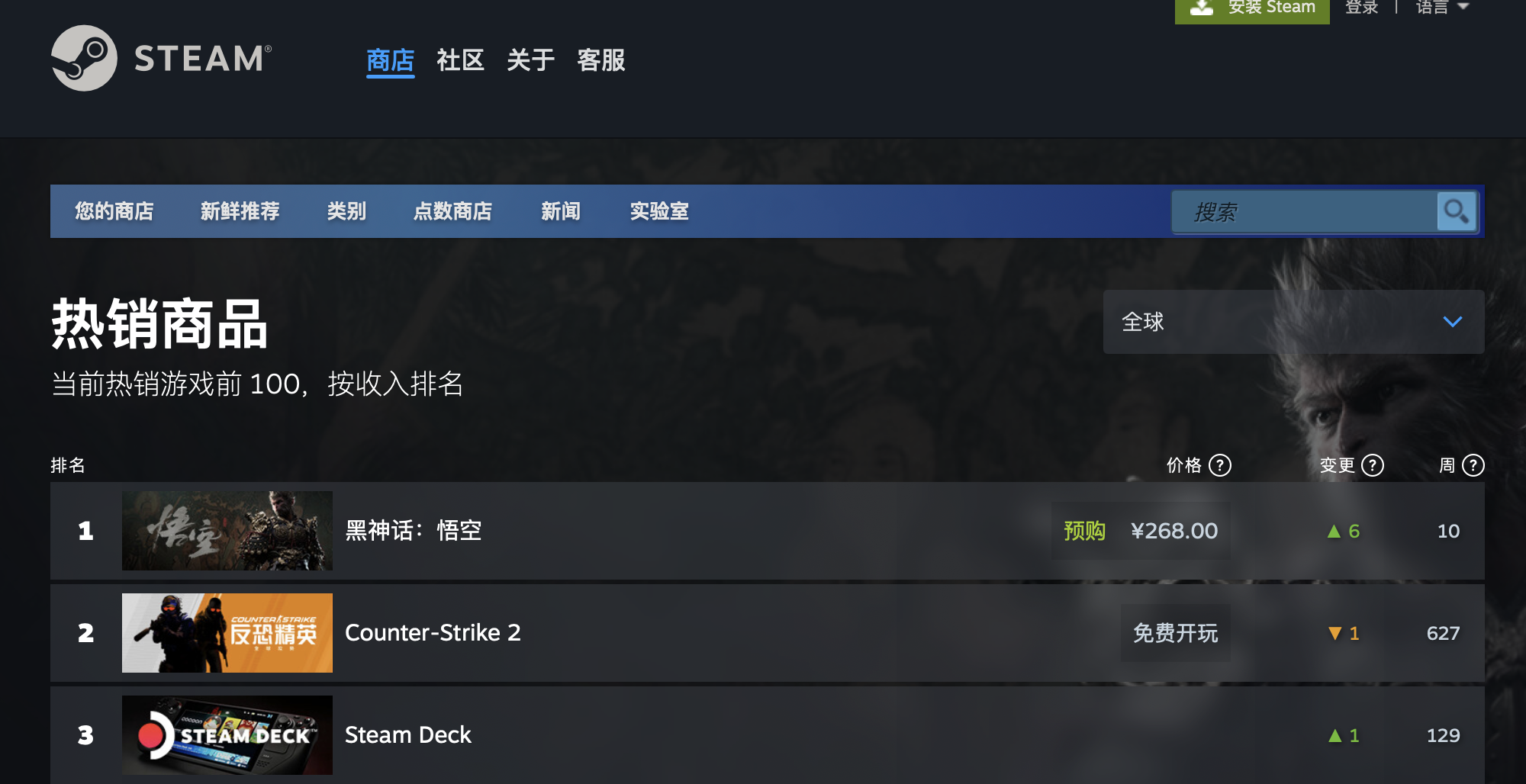 8月20日,游戏平台Steam显示,按照收入计算,目前《黑神话:悟空》排名全球第一,已经有10周在排名前100。根据“国游销量榜”统计的数据,截至2024年7月13日,《黑神话:悟空》游戏预售销量已超过120万份,预售销售额突破4亿元。