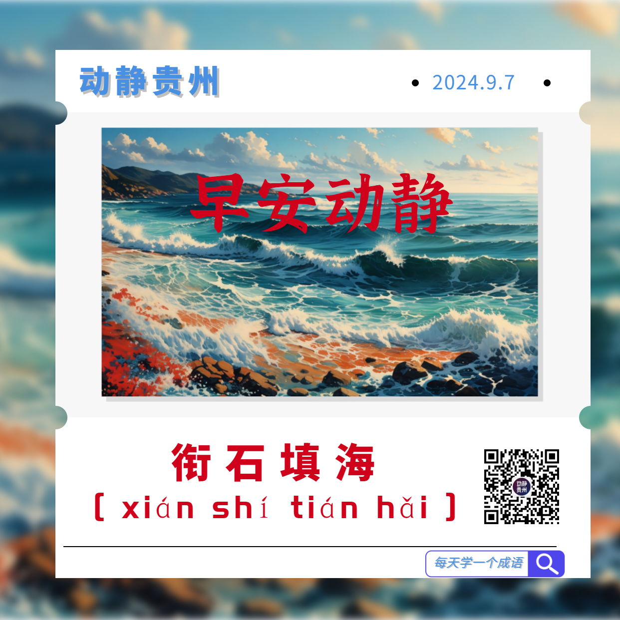 成语出处:《山海经·北山经》:“ 炎帝 之少女名曰 女娃 。女娃 游于东海,溺而不返,故为精卫,常衔西山之木石,以堙於东海。”