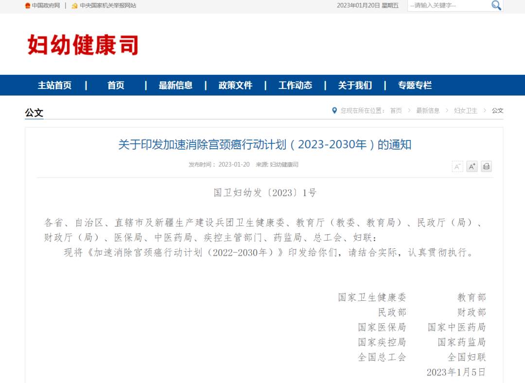 1月20日,国家卫健委网站发布关于印发加速消除宫颈癌行动计划(2023-2030年)的通知,详情如下。