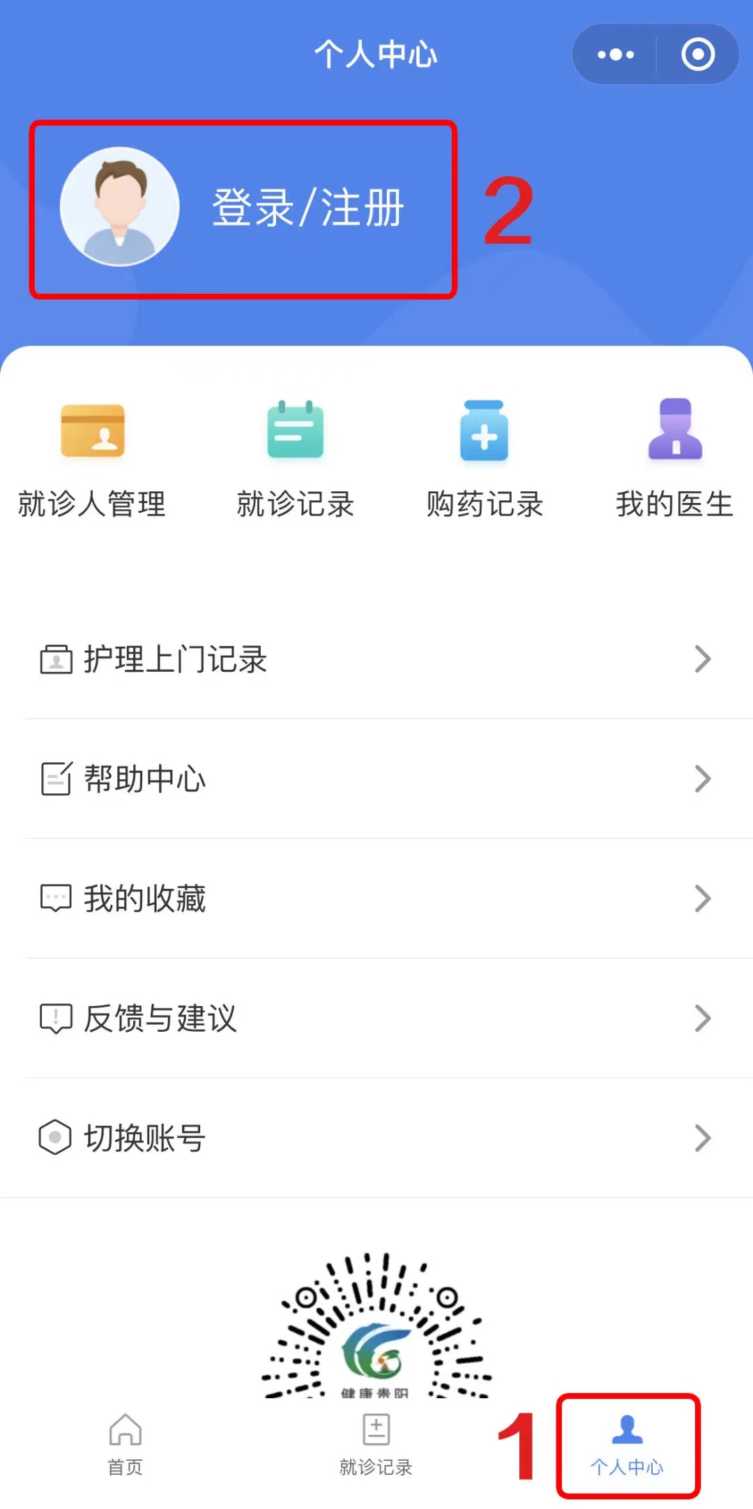 二、进入平台后,点击“个人中心” —>“登录/注册”,按照系统提示进行操作,完成注册,即可进行问诊。