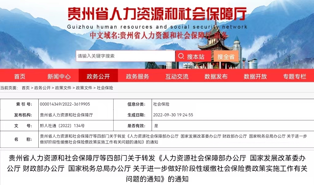 记者从贵州省人力资源和社会保障厅了解到,为切实发挥阶段性缓缴社会保险费政策效果,支持企业复工复产,近日,省人力资源和社会保障厅等四部门发布关于转发《人力资源社会保障部办公厅 国家发展改革委办公厅 财政部办公厅 国家税务总局办公厅关于进一步做好阶段性缓缴社会保险费政策实施工作有关问题的通知》(人社厅发〔2022〕50号)的通知并提出贯彻落实意见。