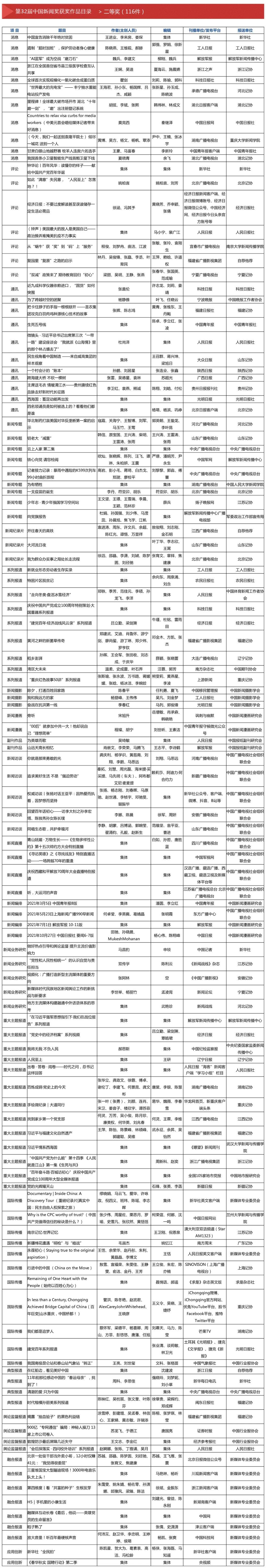 中华全国新闻工作者协会主办的第32届中国新闻奖、第17届长江韬奋奖评选结果于11月8日揭晓。来自全国各级各类媒体的376件作品获中国新闻奖,获奖作品中,特别奖3件,一等奖72件,二等奖116件,三等奖185件。同时评出的还有长江韬奋奖,长江、韬奋系列各10位获奖者。